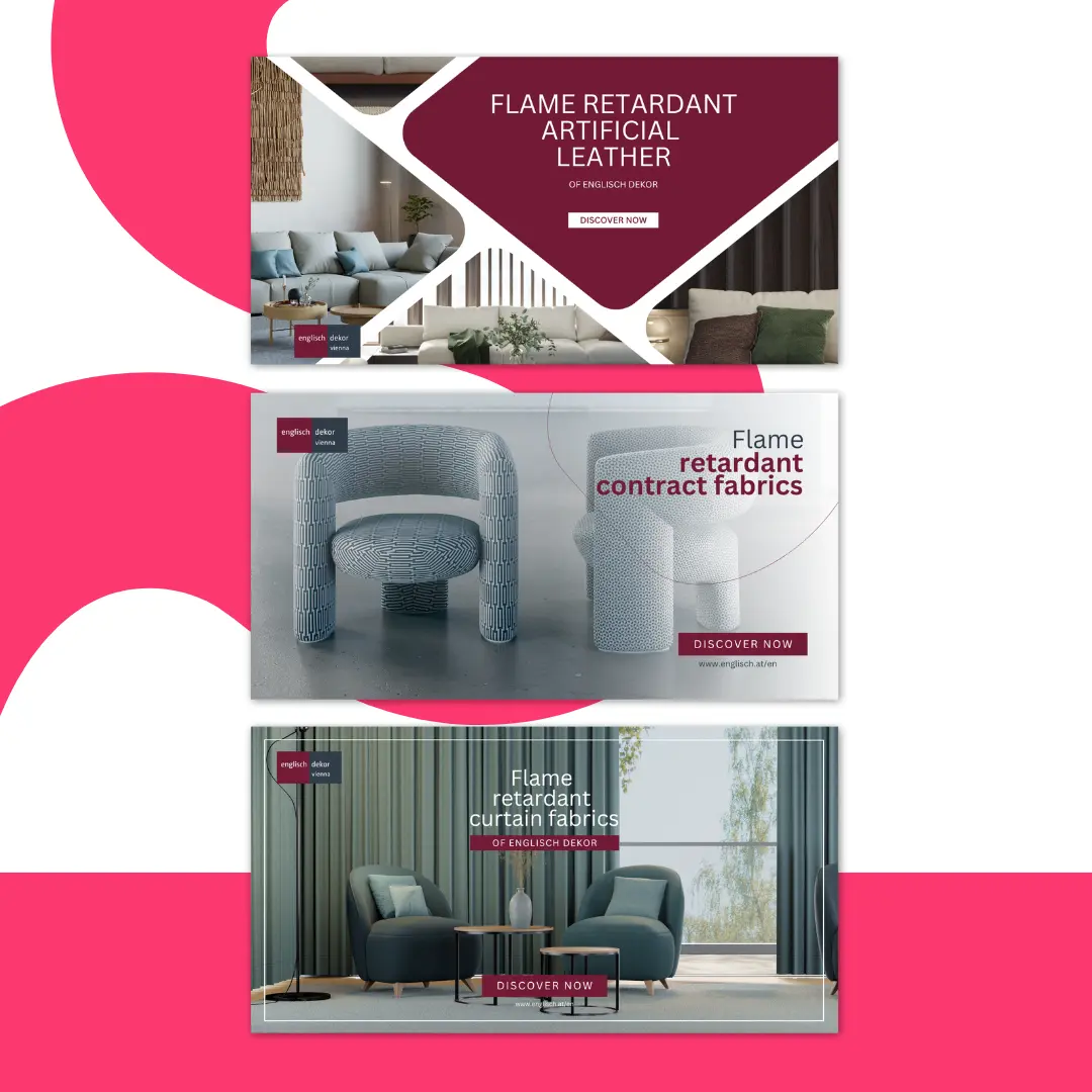 Bei der Erstellung von Google Display Ads integrieren wir konsequent die CI-Farben und Markenelemente von Englisch Dekor. Typografie, Bildwelt und Call-to-Action werden klar und hochwertig umgesetzt. Die Anzeigenformate werden responsiv für alle relevanten Ausspielungen angepasst.