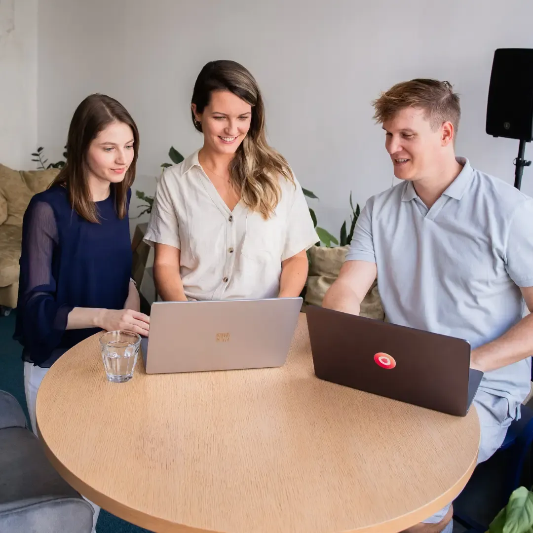 Drei Personen aus dem Einfachmarketing-Team arbeiten an Laptops an einem runden Tisch in einem modernen Büroraum.
